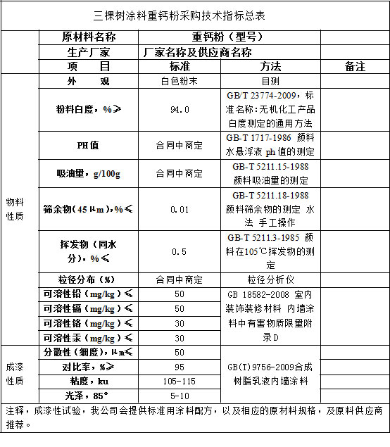 三棵樹涂料重鈣粉類采購(gòu)技術(shù)指標(biāo)