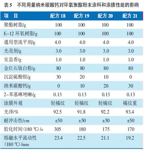 表5 不同用量納米碳酸鈣對(duì)環(huán)氧聚酯粉末涂料和涂膜性能的影響