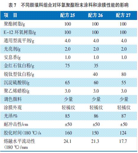 表7 不同顏填料組合對(duì)環(huán)氧聚酯粉末涂料和涂膜性能的影響