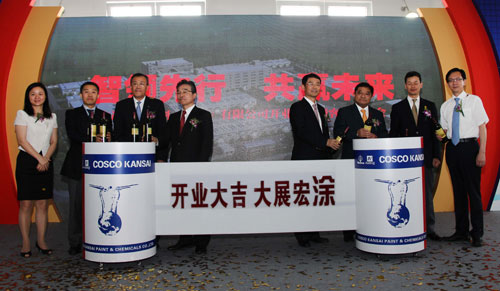 中遠(yuǎn)香港集團(tuán)張良總裁,吳樹雄副總裁、徐政軍副總裁,關(guān)西涂料株式會社石野博社長,金山區(qū)經(jīng)委王明法主任,金山第二工業(yè)區(qū)發(fā)展公司孫莉軍總經(jīng)理,客戶代表、供應(yīng)商代表及公司領(lǐng)導(dǎo)班子、員工代表等近200人出席了開業(yè)慶典。