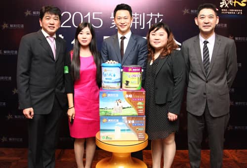 本網(wǎng)商務(wù)經(jīng)理王賽(左二)與葉氏化工執(zhí)行委員會(huì)委員兼紫荊花涂料集團(tuán)總裁葉鈞先生(中)、葉氏化工執(zhí)行委員會(huì)委員兼紫荊花涂料集團(tuán)副總裁道格拉斯?王先生(左)、紫荊花涂料集團(tuán)產(chǎn)品部經(jīng)理雷玲女士(右二)、紫荊花涂料集團(tuán)裁副總裁鄺子釗先生(右)合影