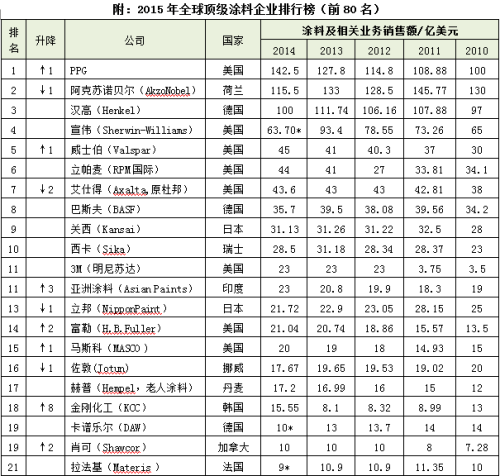 據(jù)2015年排行榜顯示,全球共有80家2014年涂料、粘合劑、密封劑等相關(guān)業(yè)務(wù)銷售額在1億美元以上的企業(yè)上榜,其中,日本16家,美國14家,德國5家,韓國4家,中國、土耳其、埃及各3家企業(yè)。波蘭Snieka和埃及Mido分別以1.44億美元、1.03億美元銷售額首次上榜。