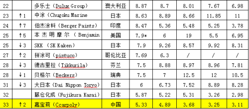 【中國涂料采購網(wǎng)】7月21日,美國《涂料世界》(Coatings World,July 2015)雜志最新發(fā)布了《2015年全球頂級涂料制造企業(yè)銷售額排行榜(2015 Top Companies)》,嘉寶莉、上海涂料、大寶三家中國企業(yè)榜上有名。嘉寶莉以2014年5.33億美元銷售額再次躋身全球涂料前40強(qiáng),以中國第一的身份位列第33位,比上年排名再前進(jìn)了兩位。這也是兩年之后嘉寶莉在該榜單中重新站上中國第一的高度。