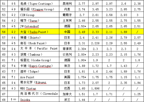 在上榜的3家中國企業(yè)中,嘉寶莉以5.33億美元位列第33位,居上榜中國企業(yè)之首。上海涂料以3.5億美元銷售額排名第43位,比上年下降了10位。從數(shù)字后面的星號可以看出,今年上海涂料并沒有主動申報(bào)數(shù)據(jù),其數(shù)據(jù)是由《涂料世界》準(zhǔn)確估算的,應(yīng)該是去除了其銷售額中的著色劑、醫(yī)藥中間體等其它非涂料業(yè)務(wù)。大寶漆以2.49億美元銷售額居第56位。前幾年均有上榜的臺灣永記和葉氏化工,今年均沒有上榜,可能業(yè)績欠佳沒有主動申報(bào)。從今年的榜單數(shù)據(jù)可以看出,嘉寶莉的銷售額已超過了約旦全國涂料、韓國三和涂料、日本武藏涂料等知名品牌的全球涂料業(yè)務(wù)量,而且短短5年間就比2010年的3.11美元銷售額增長了70%,排名也比首年上榜時的第42位前提了9位,估計(jì)在不久的將來,嘉寶莉躋身全球涂料30強(qiáng)不再是夢。