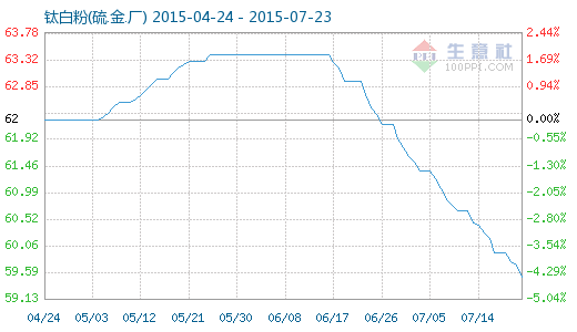 【中國涂料采購網】7月22日鈦白粉(硫.金.廠)商品指數為59.52,較昨日下降了0.2點,創下周期內的歷史新低,較2011年09月04日最高點100.00點下降了40.48%。(注:周期指2011-09-01至今) 數據監測鈦白粉價格指數曲線如下: