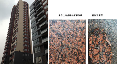 “多樂士專業彈性巖彩體系”除了具有極佳的彈性,可覆蓋0.8mm左右的裂縫,有效防止漆膜開裂外,更具有卓越的耐候性和耐洗刷性。其優異的藝術裝飾性,不但能逼真地呈現各類高檔花崗巖石材的效果,更可超越石材的顏色種類和造型限制。搭配真石漆或質感涂料使用,可實現凹凸感強烈的荔枝面或火燒面花崗巖效果,根據客戶不同預算創造出不同類型的仿真程度。
