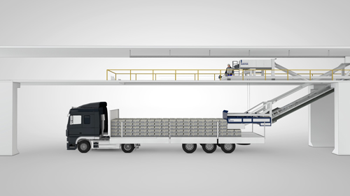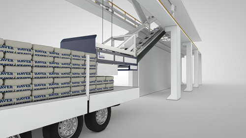HAVER SpeedRoad將來自包裝機(jī)輸送帶上的袋子組成一層樣式并把它們裝卸到卡車上。因此,可以確保卡車上每一層跺型都很完美。一旦卡車裝載完畢,裝車機(jī)即刻切換到等待模式,直到下一輛卡車到達(dá)。