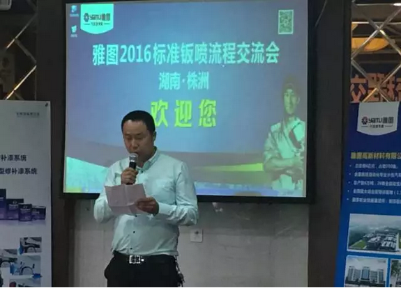 會(huì)議中,雅圖公司的華中區(qū)域的銷售經(jīng)理張經(jīng)理介紹了雅圖的服務(wù)團(tuán)隊(duì),技術(shù)工程師徐經(jīng)理介紹了雅圖優(yōu)質(zhì)環(huán)保的汽車漆產(chǎn)品與鈑噴標(biāo)準(zhǔn)流程。