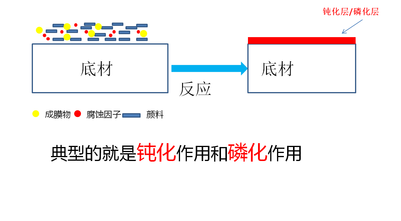 漆膜中某些防銹顏料本身或其與成膜物或水分的反應產物,對金屬底材可以起緩蝕作用,實質就是阻緩陽極反應,最典型的就是鈍化作用和磷化作用。傳統的防銹顏料如鉻酸鹽防銹顏料、鉛系防銹顏料、磷酸鹽防銹顏料