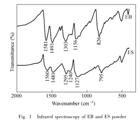本征態聚苯胺 EB 經 HPAA 磷酸酯摻雜成為導電態聚苯胺 ES,用紅外光譜對其結構進行表征,圖1 為 EB 和 ES 粉末的紅外光譜. 對于 EB 樣品,1581 和 1493 cm-1 處的峰分別對應著 CN和 C C 伸縮振動特征吸收峰,1303 cm-1 處的峰為苯環上 C—N 伸縮振動特征吸收峰,1156 cm-1處的峰為 C—H 的平面彎曲振動吸收峰,826cm-1 處的峰為對位取代的苯環吸收峰. 對 ES 而言,上述吸收峰均變寬,且向低波數移動,ES 樣品在 1240 cm-1處出現了新的吸收峰,它對應著P O伸縮振動吸收峰 [15] ,表明 HPAA 成功實現了對 EB 的摻雜.