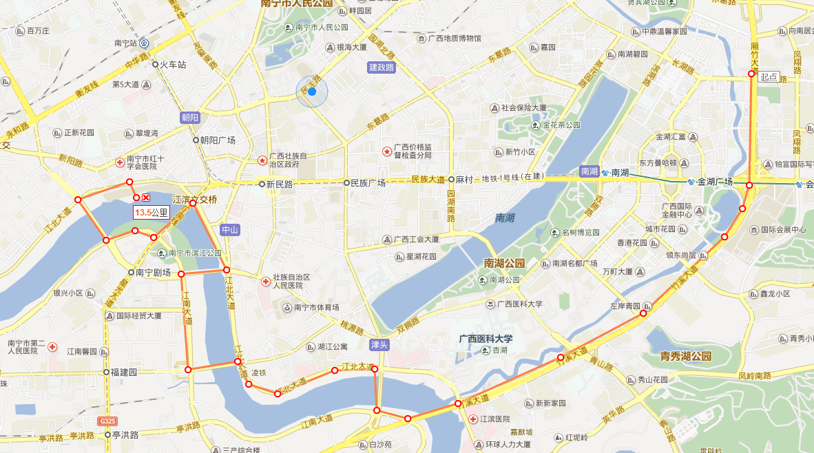富安居→竹溪大道→葫蘆鼎大橋→白沙大橋→凌鐵大橋→桃源橋→邕江大橋→北大橋→民生廣場(chǎng)(13.5公里)