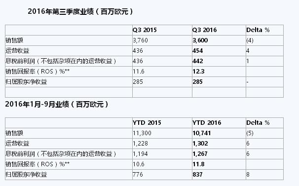 ·息稅前利潤*上升1%,達(dá)4.42億歐元(2015年同期為4.36億歐元),得益于持續(xù)開展的績效提升舉措和成本降低,匯率的不利影響抵消了部分增長