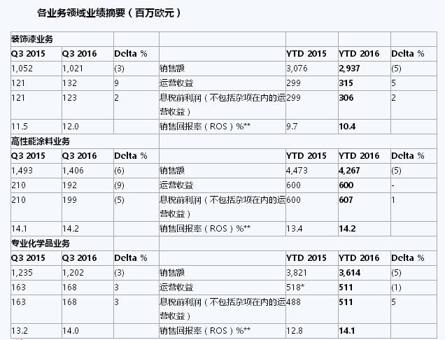 “公司在第三季度盈利能力進(jìn)一步提高,所有業(yè)務(wù)領(lǐng)域的回報率均有所增長,裝飾漆和專業(yè)化學(xué)品的銷量實現(xiàn)增長。我們會進(jìn)一步改善財務(wù)系統(tǒng)實現(xiàn)強大的現(xiàn)金管理。公司已決定將期中股息提高6%,至每股0.37歐元。”