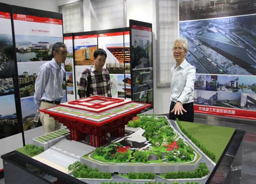 何鏡堂院士闡述了工作室改造工程所涉及的建筑科技及嶺南特色,對“兩觀三性”建筑理論研究實踐成果展中諸多代表性作品如“上海世博會中國館”、“侵華日軍南京大屠殺遇難紀念館擴建工程”等一一進行了介紹。(參觀圖)