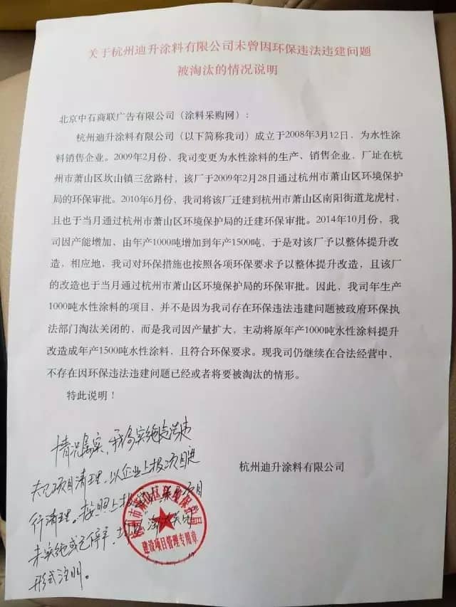 杭州市蕭山區環境保護局致函中國涂料采購網,就杭州迪升涂料有限公司淘汰關停的項目進行了說明,據蕭山區環保局表示,杭州迪升涂料有限公司的淘汰關停項目屬于擴建技改,蕭山區環保局實施違法違規項目清理時,以企業上報項目進行清理,按照上報要求,關于項目未實施或停產,均以淘汰關閉形式注明。