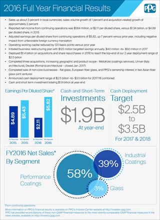 PPG公司董事長兼首席執行官Michael H. McGarry 表示:“盡管全球經濟增長緩慢,各地區表現參差不齊,再加上非常不利的匯率影響,我們第四季度和全年調整后每股攤薄收益仍然實現了穩步增長。通過提高銷量,積極的成本管控,加上多項致力于盈利增長的現金部署,公司在2016年仍然實現了業務發展的各項里程碑。”