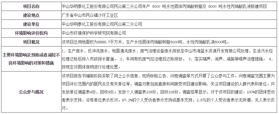 根據建設項目環境影響評價審批程序的有關規定,經審議,我局擬批準《中山華明泰化工股份有限公司民眾第二分公司年產 5000 噸水性固體丙烯酸樹脂及 6000 噸水性丙烯酸乳液新建項目環境影響報告書》,為體現公開、公正的原則,強化公眾參與,現予公示5個工作日,如有意見,請在公示期內來信或來電向我局反映。