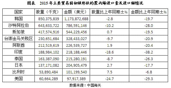 2015年,我國初級形狀的聚丙烯進口額排名前五大市場為韓國、沙特阿拉伯、新加坡、臺澎金馬關稅區、阿聯酋。其中,進口額最高的是韓國,為1,173,872,688美元,比上年同期下降19.7%;其次是沙特阿拉伯,為786,591,146美元,比上年同期下降28.0%;最低的是阿聯酋,為226,539,727美元,比上年同期下降20.4%。