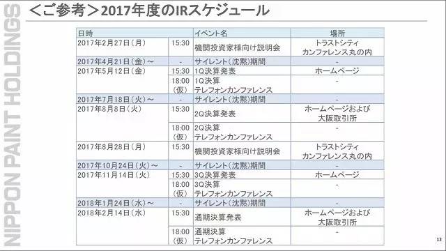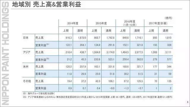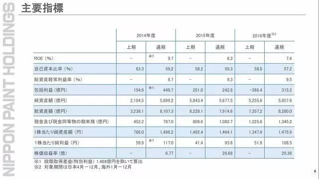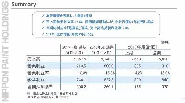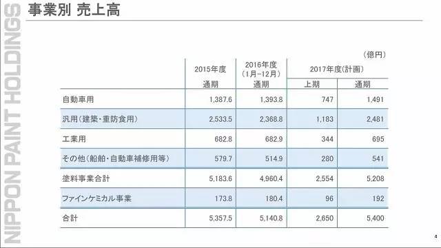 日涂控股預(yù)計,2017年度銷售收入5400億日元,營業(yè)利潤810億日元,營業(yè)利潤率為15.0%,經(jīng)常利潤840億日元,凈利潤370.億日元。