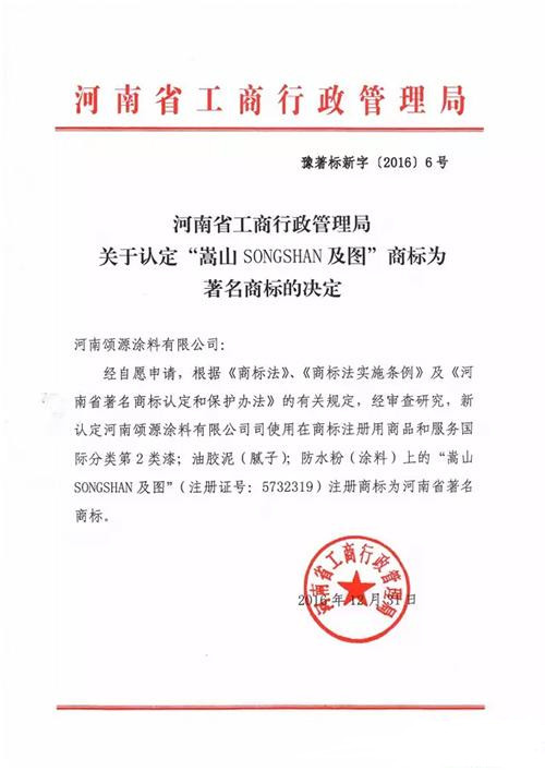 【中國涂料采購網】河南省工商行政管理局發出公布,河南頌源涂料有限公司(以下簡稱頌源制漆)的“嵩山SONGSHAN及圖”被認定為“河南省著名商標”。在新認定的名單中,嵩山漆是唯一一個生產環保水性建筑涂料的品牌。