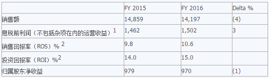 息稅前利潤1上升3%,達15.02億歐元(2015年同期為14.62億歐元),得益于銷量增加、持續開展的績效提升舉措和成本降低