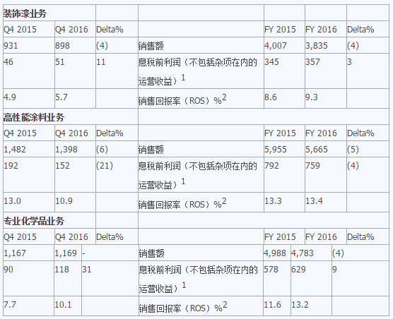 裝飾漆業務與專業化學品業務銷量增長;高性能涂料業務銷量持平